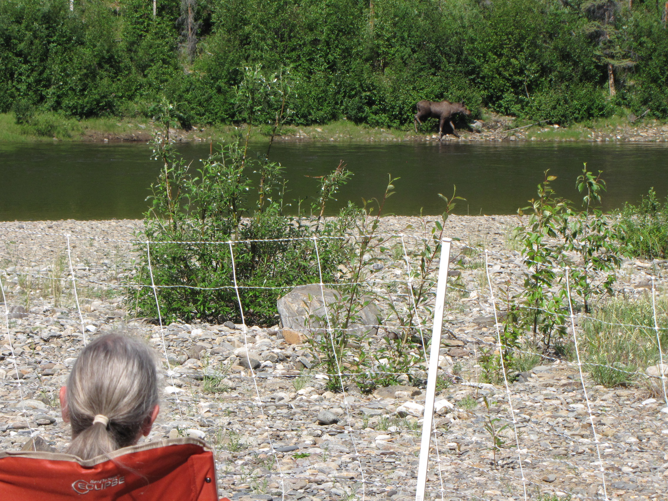 and gave a grunt and a snort which woke serge up. He slowly opened the inside window to look out thru the mosquito screen and saw this giant moose butt