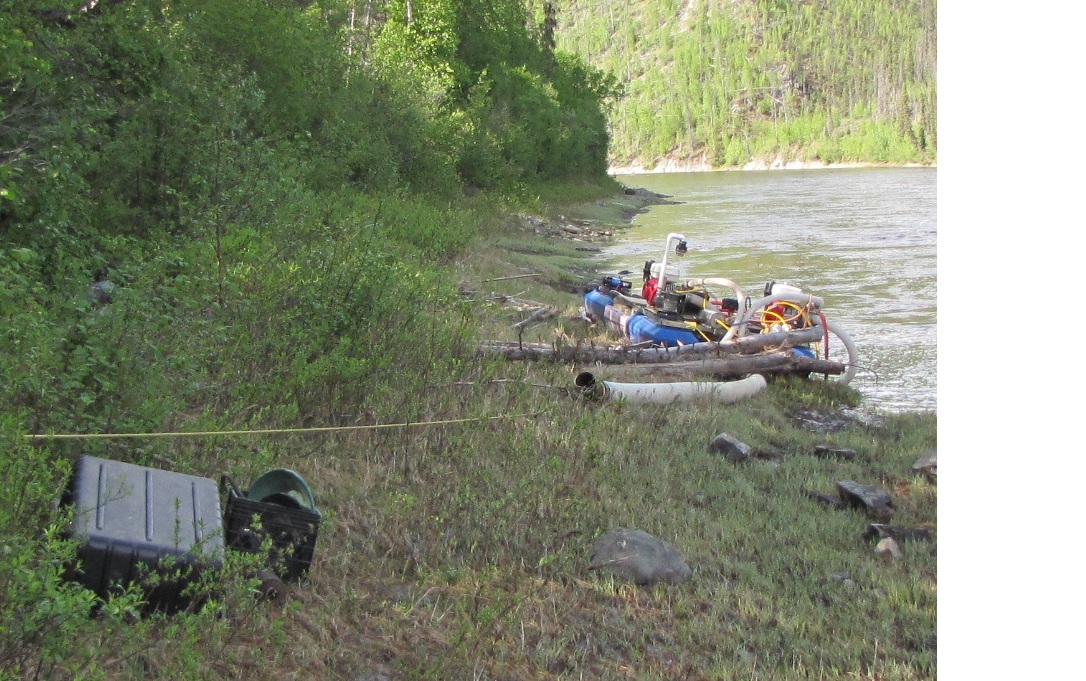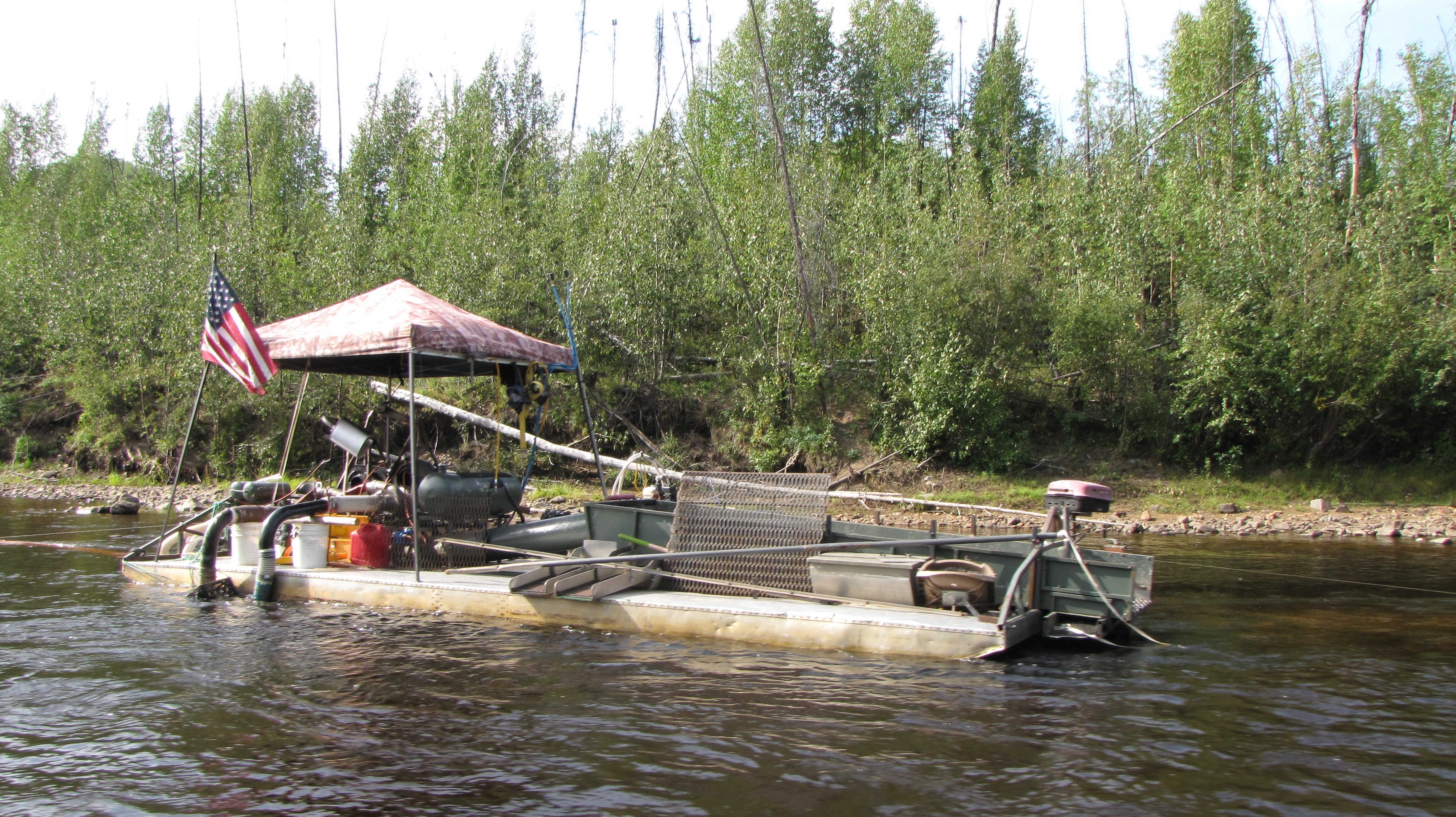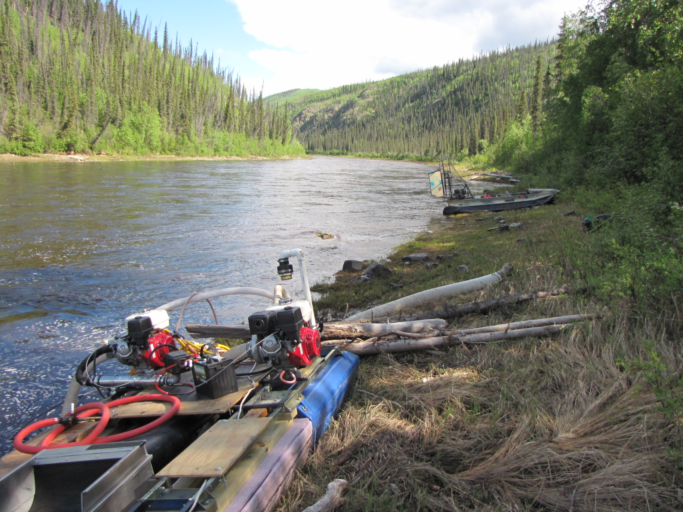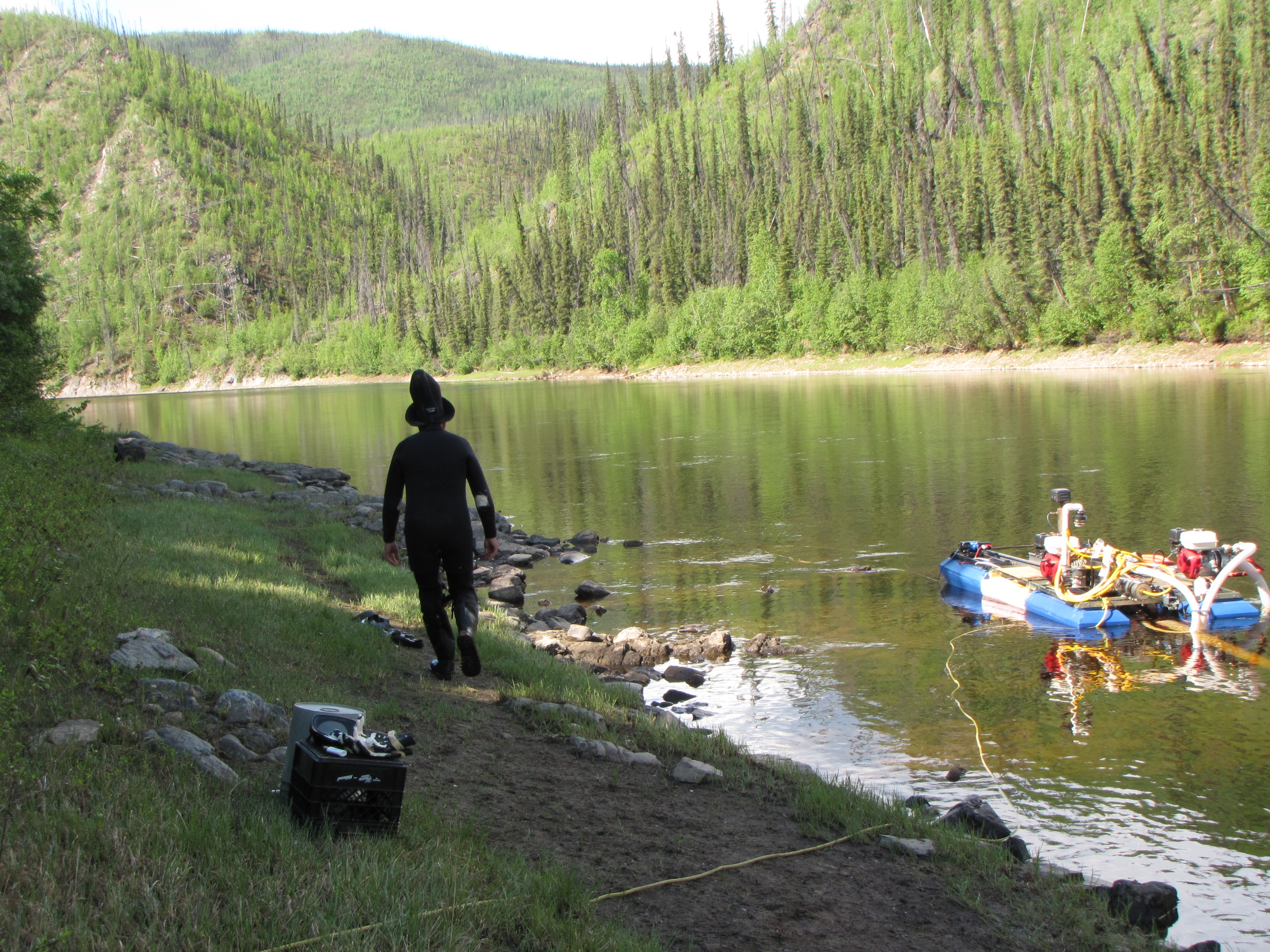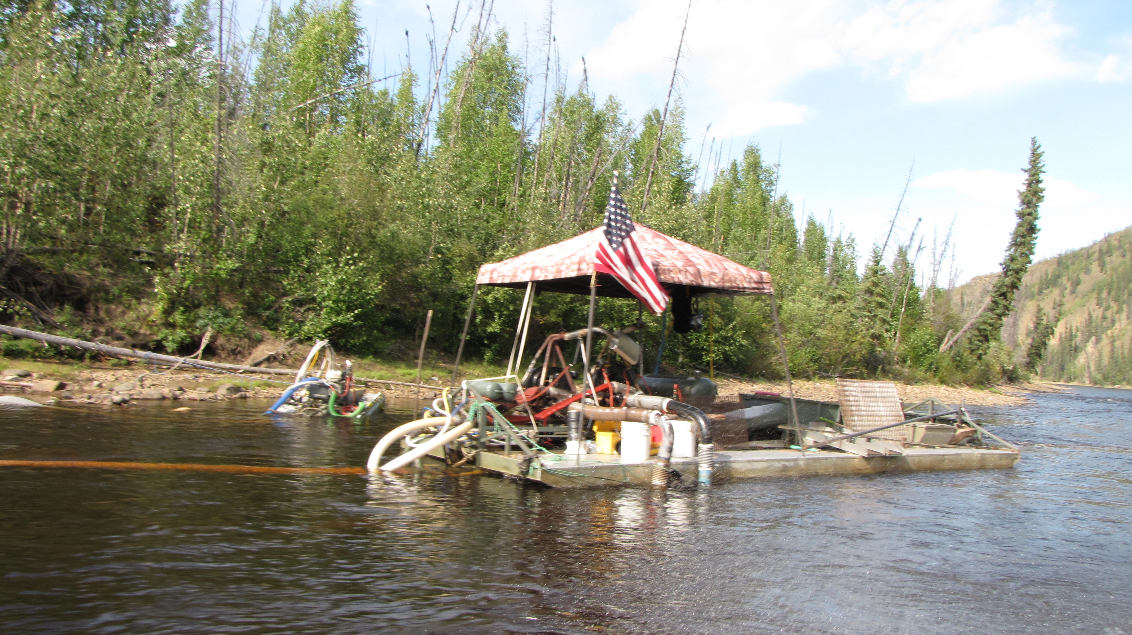 The HOV floating in the water as serge is dredging near the middle of the river on a claim that we hope will produce some good gold.