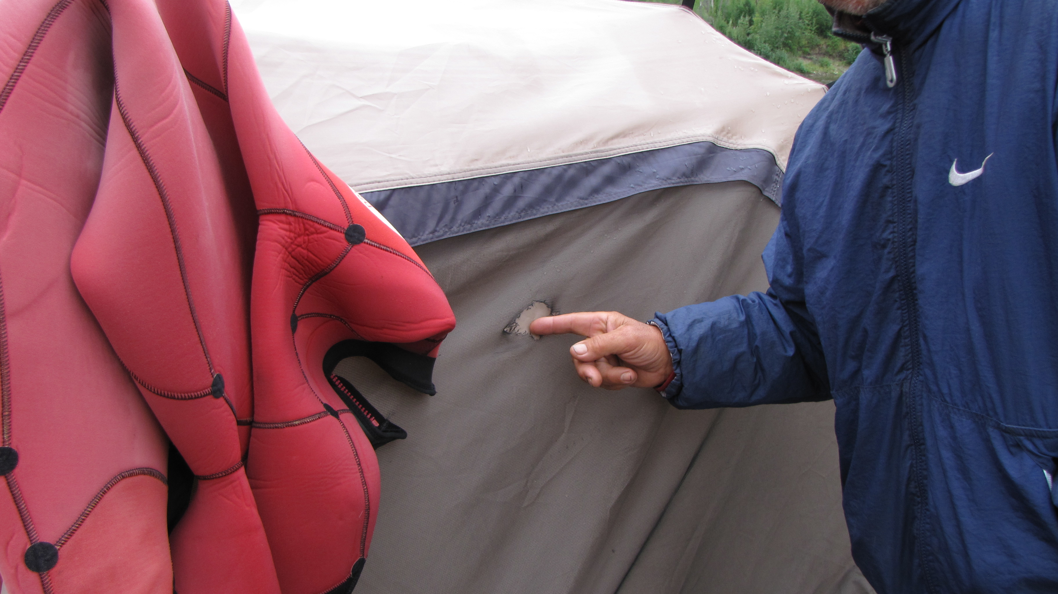 Good news is Serge is a terrible shot and completly missed the moose and no damage was done to tent, fence, Serge or the Moose!